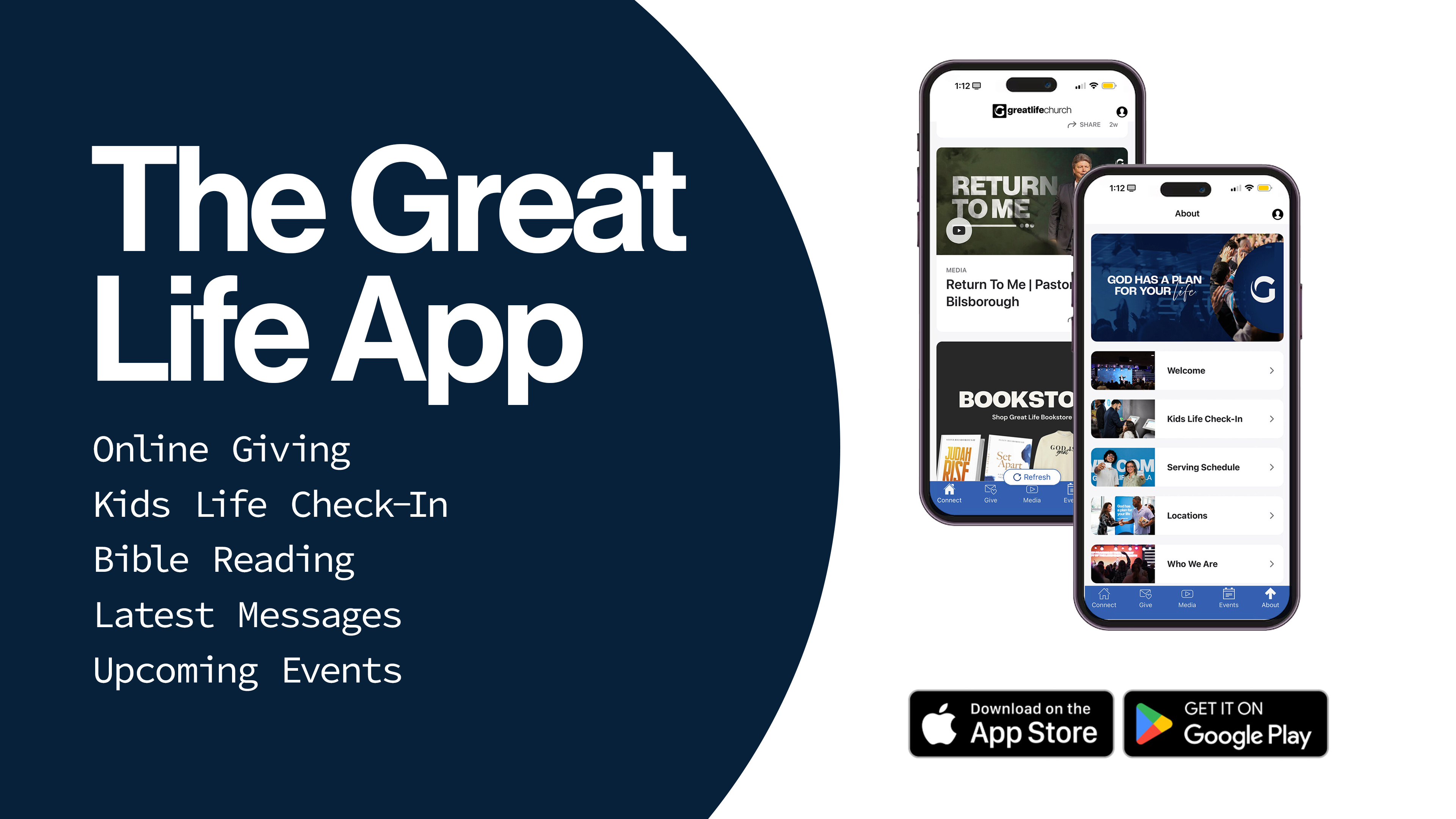If you are not yet an app user, we invite you to download the Great Life App to stay connected with everything happening at Great Life Church! Including Online Giving, Kids Life Check-In, Team Serving Schedule, Bible Reading, Latest Messages, and more.