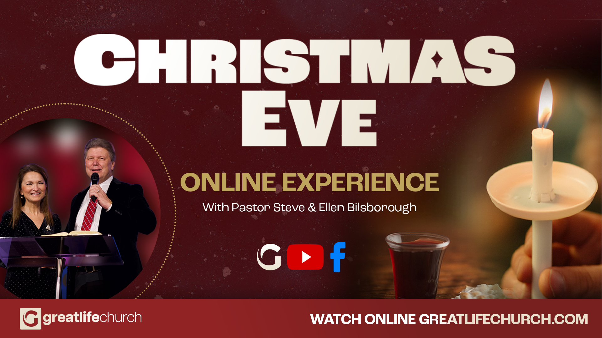You are invited to our Christmas Eve Online Experience with Pastor Stephen & Ellen Bilsborough, this December 24th at 7pm ET. Tune in for a special one-hour broadcast live on YouTube, Facebook Live, and the Great Life App/greatlifechurch.com. We will be participating in candlelight communion together, plus special music, and an encouraging word. Invite someone, and let's celebrate together.